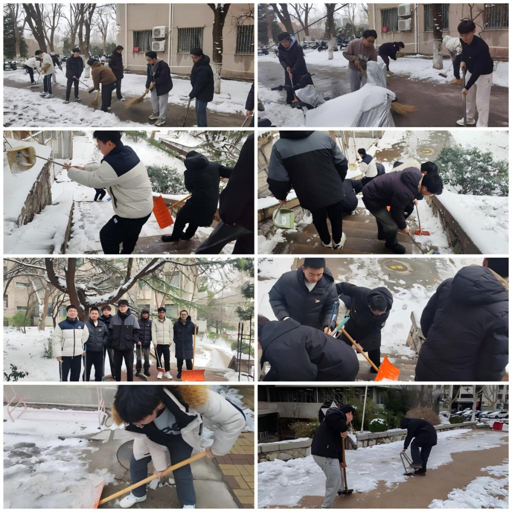 在舜耕校区,凛冽寒风呼啸,却吹不散同学们的热情。大家分工明确,配合默契,哪怕积雪溅湿裤脚、寒意透骨也浑然不顾;有的同学拿着扫帚仔细清扫主干道上的雪渣和冰块,不放过任何一个角落,扫帚与地面摩擦的“沙沙”声,宛如激昂的劳动赞歌。