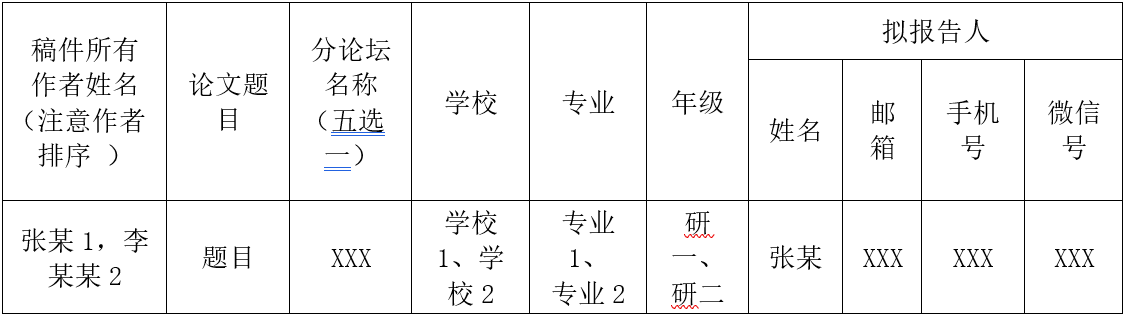 本次论坛投稿方式为电子邮箱投稿,投稿邮箱为:[email protected],投稿截止时间:2026年9月24日24时。请将投稿邮件标题命名为“论坛投稿+分论坛名称+拟报告人姓名+学校”,投稿文件命名为“分论坛名称+拟报告人姓名+学校”,并在邮件正文中根据以下示例注明投稿信息: