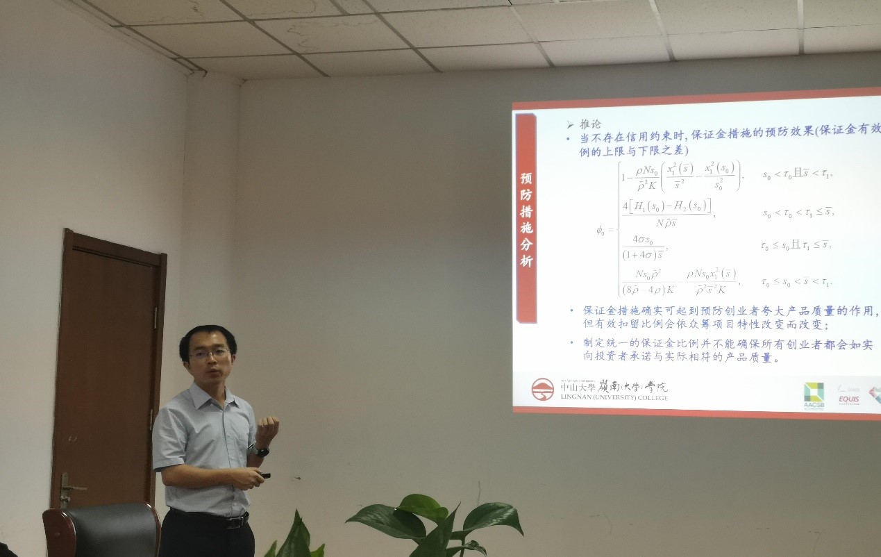 曾教授的报告首先构建了预售众筹发起阶段与销售阶段的理论决策模型;然后求解模型得到了创业者的最优众筹价格及向投资者承诺的产品质量,分析了创业者夸大产品质量的动机;其次设计了保证金与信用约束组成的预防措施,分析了预防措施对创业者令大产品质量行为的预防效果。研究结果表明:在无预防措施情形下,创业者会向投资者夸大产品质量以获得众筹成功与追求收益最大化;众筹平台收取保证金虽能对创业者夺大产品质量行为起到预防作用但预防效果有限,增加信用约束能弥补保证金措施的缺点,提高预防措施的预防效果。最后本文通过数值算例进一步展示了理论模型所得到的相关结论。曾燕教授的报告内容新颖,思路清晰,具有很强的学术价值和应用前景。曾燕教授与师生进行互动和交流,详细地回答了保证金扣留比例、优化决策的求解等问题。