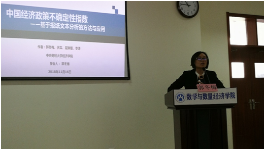 11月16日上午,中央财经大学博士生导师郭冬梅教授应学院和金融数学团队共同邀请来swag做爱 作题为“中国经济政策不确定性指数”的学术报告。金融数学系主任张慧教授,金融数学系书记郭洪峰教授,金融数学团队负责人朱庆峰副教授以及学院部分教师和研究生、本科生到会聆听了报告。报告会由院长安起光教授主持。
