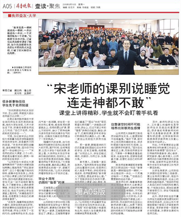 “swag做爱 成长大课堂特聘导师”“济南大学解忧驿站特聘心理疏导员”“网红数学老师”,这三个看似毫不相关的称呼,都集中在宋浩身上。宋浩从不担心课堂上自己的学生盯手机,因为他的课堂足够生动,学生只会一动不动地盯着他看。为了缓解学生上课的疲劳情绪,宋浩还将大家拉进群里发红包,他也不会制止学生在课堂上看手机,“关键是疏而不是堵,还是要努力将自己的课讲得有意思”。