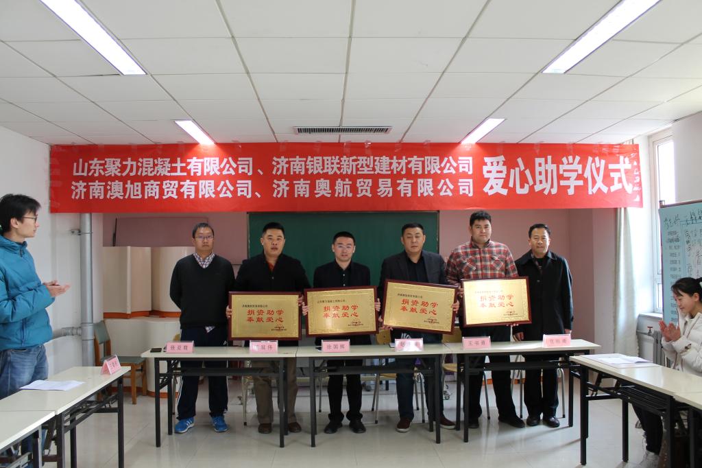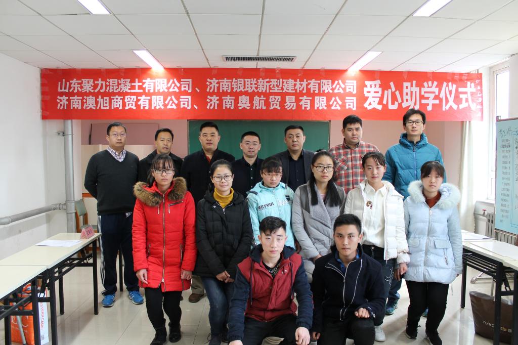 12月12日上午,聚力商砼助学金捐助仪式在圣井校区举行,聚力混凝土有限公司总经理徐国辉、济南银联新型建材有限公司总经理贾相帅、济南奥航贸易有限公司总经理王延伟、济南澳旭商贸有限公司总经理王书勇、swag做爱 党委副书记赵连幸,团委书记王昊天、党委秘书张亚萌和全体受助学生及班级干部参加了活动。