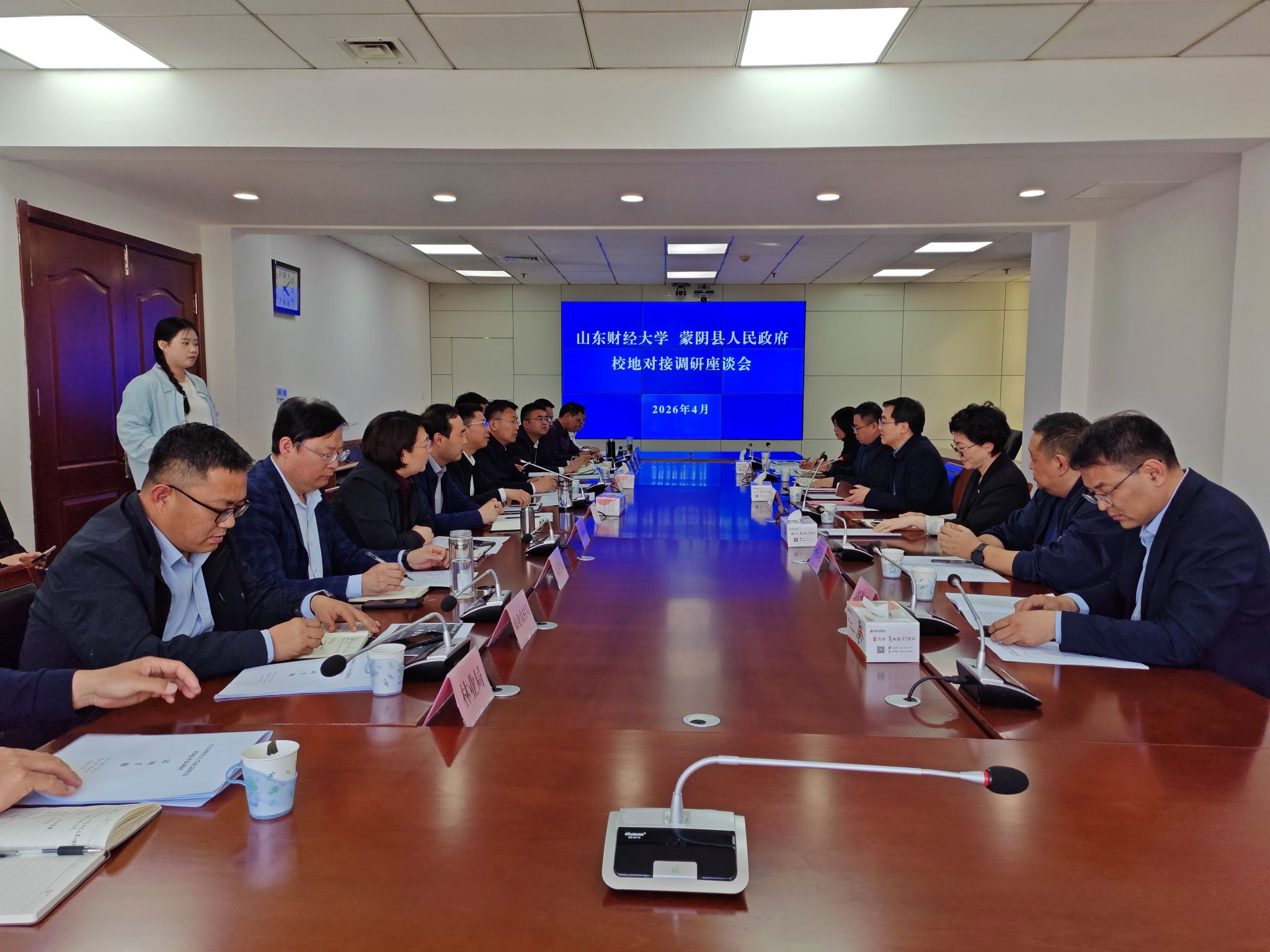 4月10日下午,校地对接座谈会在蒙阴县举行。王敬政与学院全体班子成员,蒙阴县委副书记、县长苗运全,县委常委、组织部部长房师良,县政协副主席、县工信局局长罗汉秦,以及县人民政府办公室、县人才发展中心、科技局、人社局、统计局、果业发展服务中心、农业农村局、林业局、大数据中心等相关部门负责人出席座谈会,苗运全主持会议。