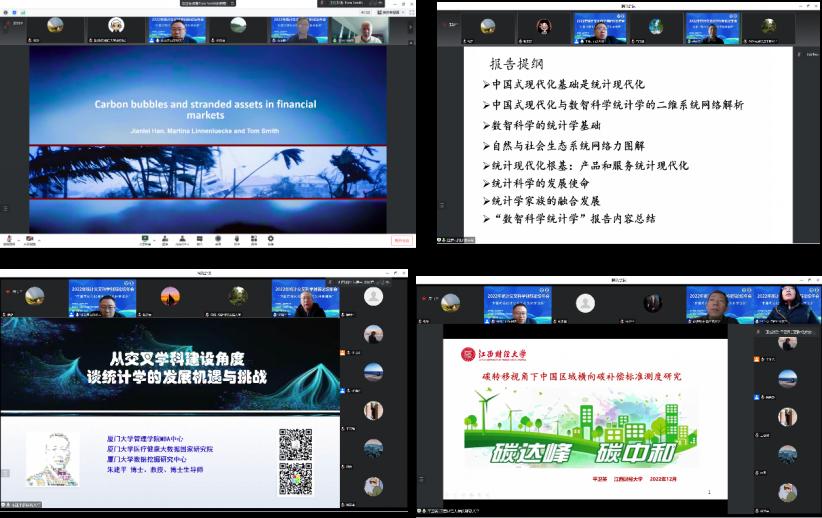开幕式后澳大利亚社会科学院院士、麦考瑞大学Tom Smith教授,中国人民大学杰出学者特聘教授、竞争力与评价研究中心主任赵彦云教授,健康医疗大数据国家研究院副院长、厦门大学数据挖掘研究中心主任朱建平教授,江西财经大学统计学院院长平卫英教授分别围绕“Carbon bubbles and stranded assets in financial markets”“数智科学统计学”“从交叉学科建设角度谈统计学的发展机遇与挑战”“碳转移视角下中国区域横向碳补偿标准测度研究”等主题做了特邀报告。下午,澳大利亚麦考瑞大学Boning Zhang等9位青年博士分别做了专题报告。山东大学金融研究院副院长石玉峰教授、成都信息工程大学统计学院院长李勇教授、天津财经大学统计学院院长杨贵军教授、曲阜师范大学统计与数据科学学院院长赵胜利教授、山东师范大学数学与统计学院副院长赵强教授分别主持相关主题发言。