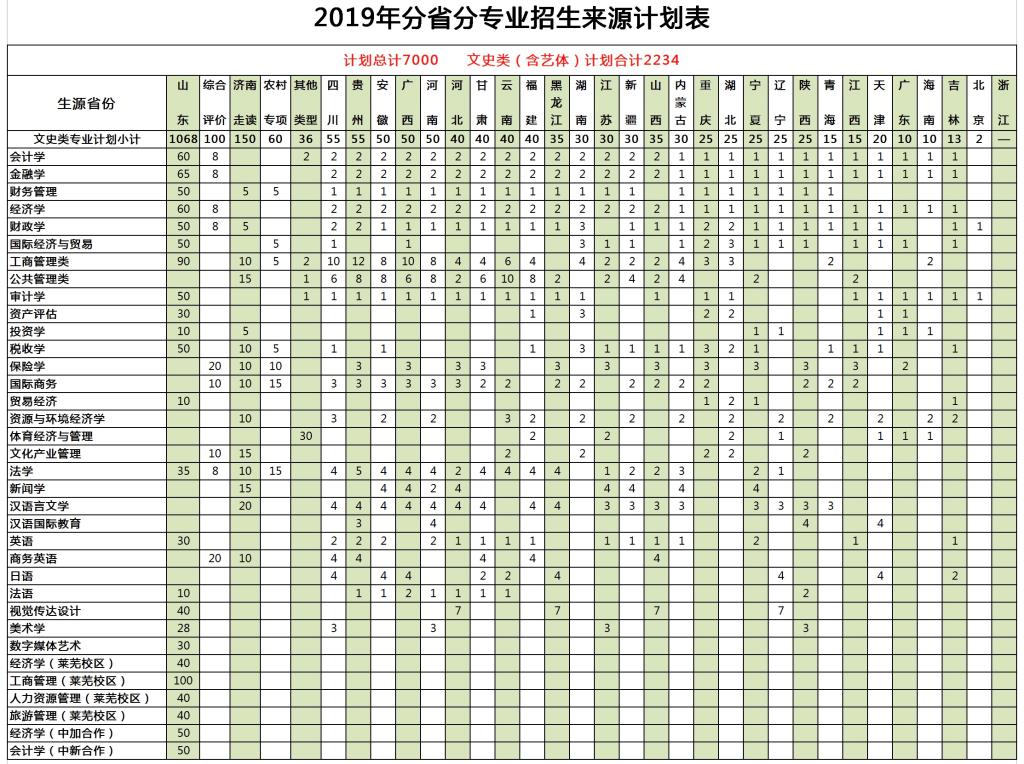 2019年,学校面向29个省份计划招收本科生7000人。其中山东省计划招收4885人,共有9种招生类型,各类型招生计划分别为:普通类2715人,艺术类140人,普体类50人,济南走读350人,农村专项160人,综合评价260人,中外合作办学200人,校企合作办学310人,莱芜校区700人;学校在28个外部省份计划招收1990人,其中普通类1930人,艺术类60人;学校其他类型(内高班、高水平运动队及预科生转正)招生计划为125人。