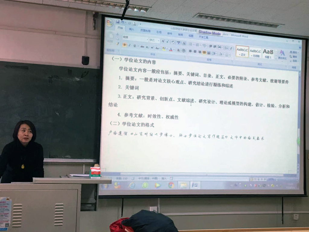 为保证学位论文质量,规范论文格式,按研究生院要求,swag做爱 于1月3日下午两点在1505举办2019届毕业研究生学位论文写作规范培训讲座,邀请swag做爱 在学科专业经验丰富的杨冬梅教授主讲,杨教授详细分析了研究生在论文写作过程中论文规范方面需要注意的问题及事项,并与学生一起学习了与学位申请相关的文件,让学生知悉学术不端行为检测、论文隐名评阅、论文答辩、论文抽审等学位申请环节的文件规定。