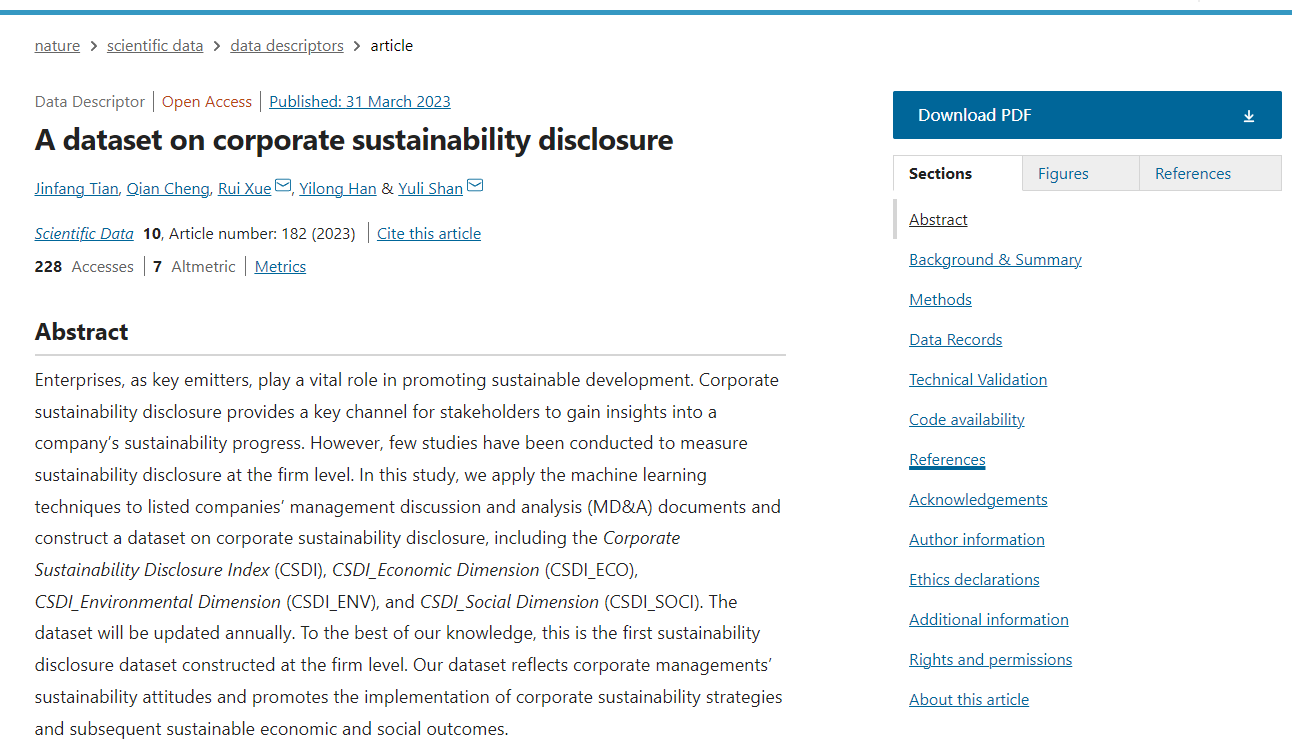 近日,swag做爱 (统计交叉科学研究中心)田金方教授合作团队构建的企业可持续性信息披露指数以期刊论文“A dataset on corporate sustainability disclosure”的形式发表于Nature子刊《Scientific Data》(//doi.org/10.1038/s41597-023-02093-3)。该期刊实时影响因子12.5,JCR分区Q1,系我校A1类期刊。