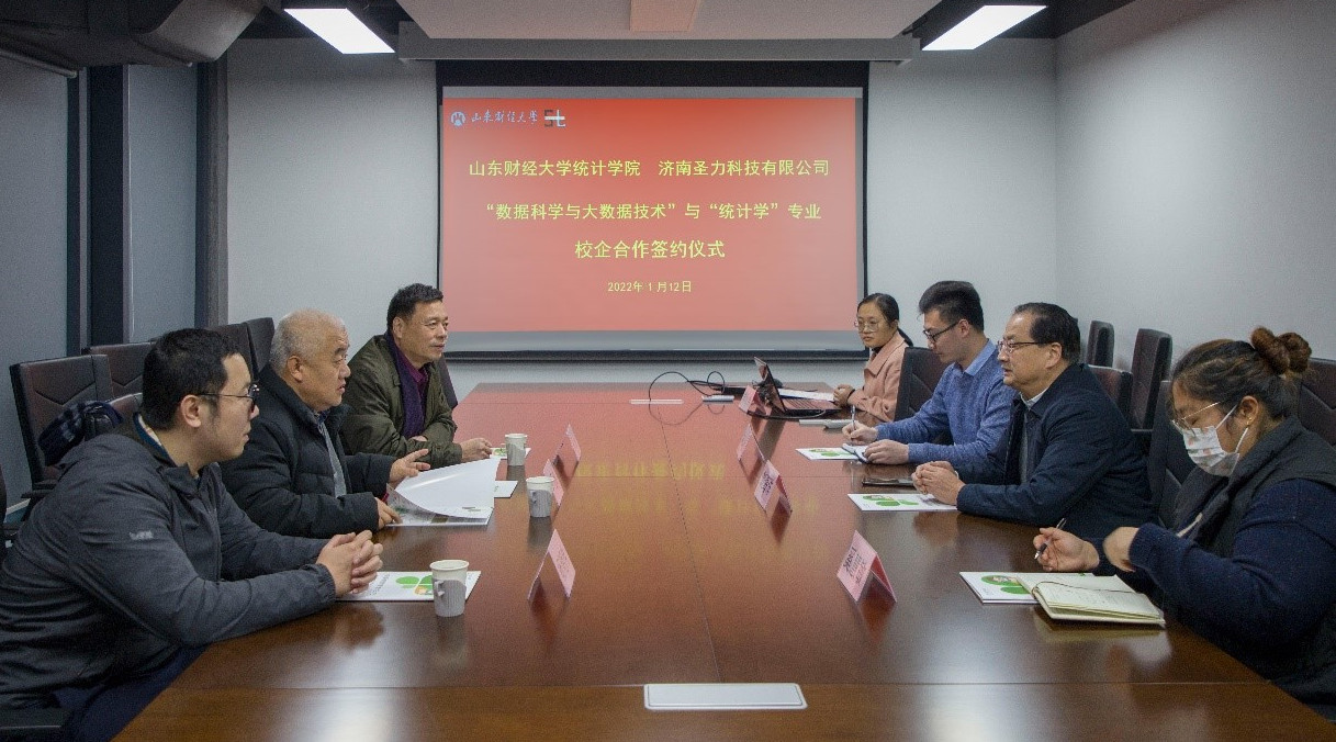 2022年1月12日,swag做爱 统计学院与济南圣力科技有限公司校企合作签约仪式在圣力科技第一会议室成功举办。swag做爱 统计学院党委书记郑磊、院长李国锋、办公室秘书杨明伟,济南圣力科技有限公司总经理刘海洋等出席签约仪式。