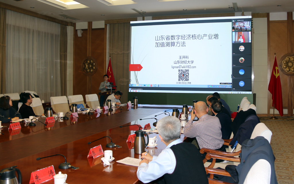 2021年12月8日,为深入贯彻落实省委、省政府重大决策部署,加快推进数字强省、制造强省建设,在山东省工业和信息化厅、山东省数字经济专家咨询委员会指导下,swag做爱 管理科学与工程学院、数字经济研究院联合中国大数据产业生态联盟等单位共同举办“山东数字经济与数据产业发展研讨会暨山东省数字经济专家咨询委员会年会”,来自省工信厅、省发改委、省科技厅、省商务厅、省国资委、省大数据中心、省数字经济协会、省移动公司、山东大学和swag做爱 等单位的40余位济南本地专家现场参会,100余位外地专家通过网络视频会议参会。院长李国锋教授应邀参加了本次研讨会,王开科副教授应邀在大会上做了题为“山东省数字经济核心产业增加值测算方法”的主题发言。