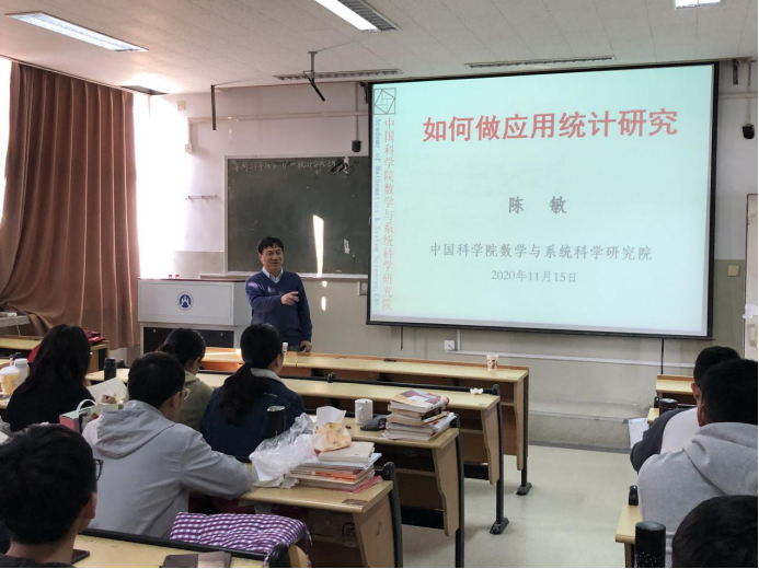 2020年11月15日上午,中国科学院数学与系统科学研究院陈敏教授应邀来swag做爱 进行学术交流并做了题为“如何做应用统计研究”的学术报告,会议在一号教学楼1505举行,学院2020级全体研究生参加了此次交流,报告会由李国锋院长主持。