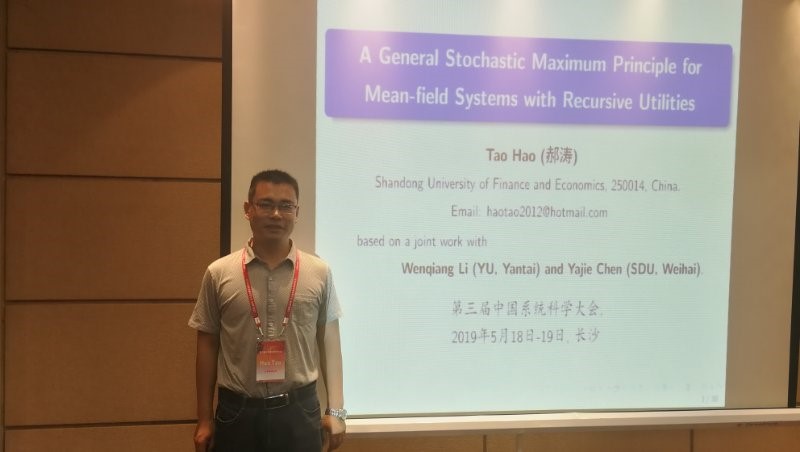 2019年5月18日至19日,swag做爱 郝涛老师应邀参加在长沙举办的第三届中国系统科学大会,并做题目为“A General Stochastic Maximum Principle for Mean-field Systems with Recursive Utilities ”的报告。大会由上海系统科学研究院主办,国防科技大学承办,中国科学院数学与系统科学研究院系统科学研究所、北京师范大学系统科学学院、北京交通大学交通系统科学与工程研究院、中国船舶工业系统工程研究院、中国系统工程学会、中国自动化学会控制理论专业委员会等单位协办。旨在为系统科学及其相关领域的国内外专家学者提供一个学术交流平台,促进相关学科的交流、发展和融合,促进新方向、新领域的产生。