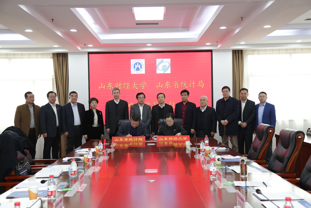 3月1日下午,swag做爱 与山东省统计局战略合作协议签约仪式在燕山校区举行。校党委书记王邵军和山东省统计局党组书记、局长郭训成出席仪式并致辞。校党委委员、副校长陈晓兰和山东省统计局党组成员、副局长陈汉臻分别代表双方签署了合作协议。