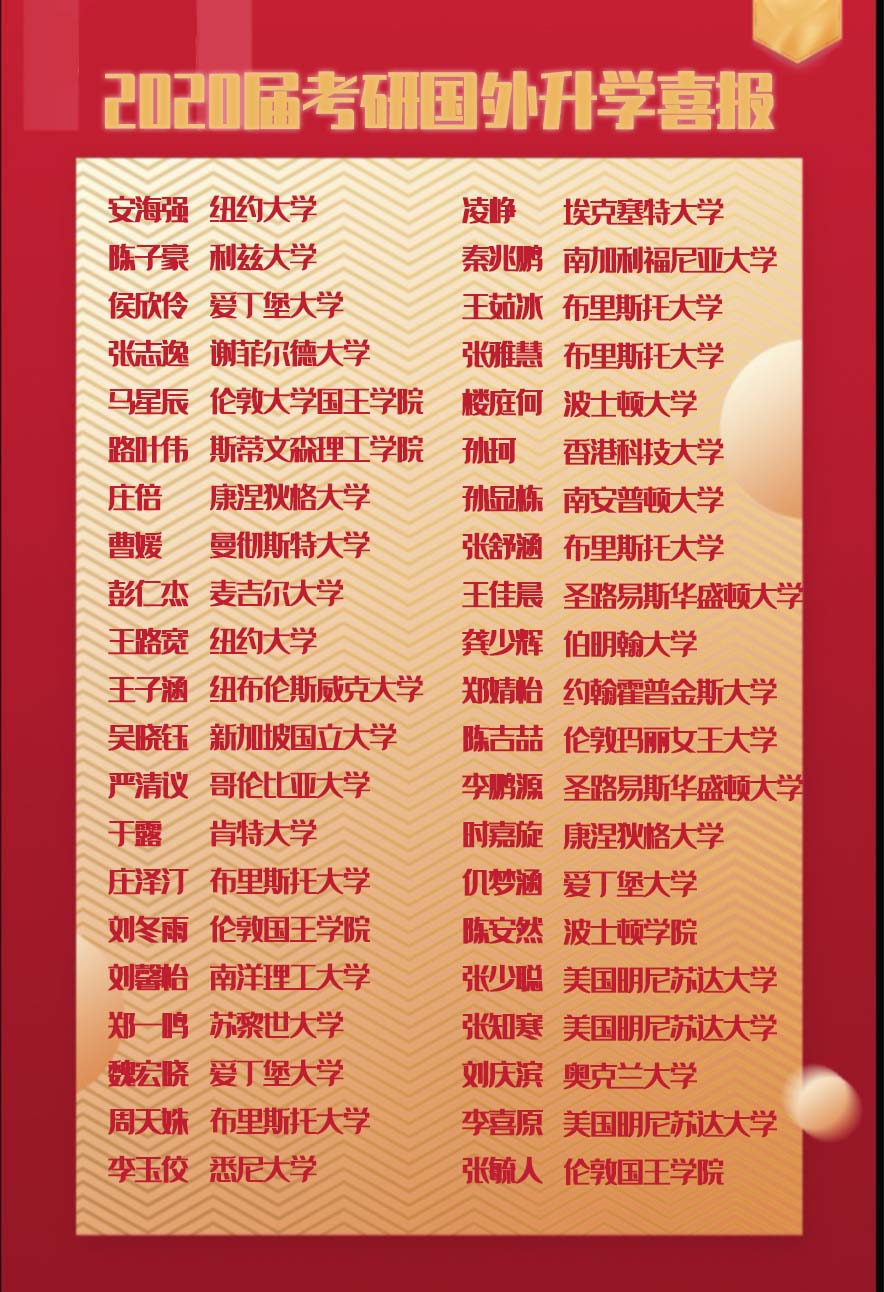 国内升学的同学中,有54名同学考上北京大学、复旦大学、南开大学、天津大学、山东大学、吉林大学、四川大学、中国海洋大学、上海财经大学、中南财经政法大学、中央财经大学、对外经贸大学等“985”、“211”、“双一流”名校,占国内升学总数的66%。